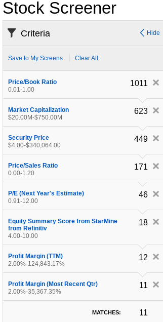 - If a stock makes the screener list, research the stock to make sure it’s viable. I don’t buy Chinese stocks and wish to buy in sectors that I feel are overlooked. Most days that I run the screener there is nothing worthwhile to buy.