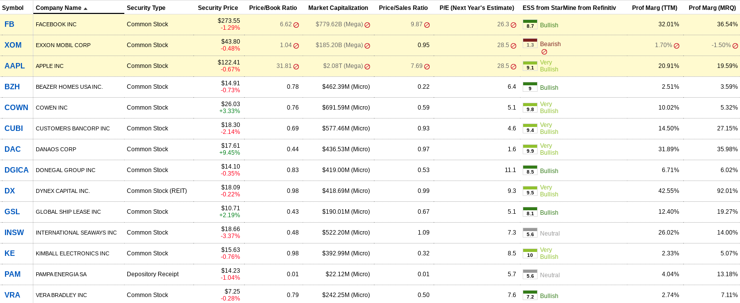 Apple’s Price/Book ratio is 31 and Price/Earnings is 28. It is not a good value investment at all. Based on the report, I’d take a closer look at CUBI and COWN. DAC shot up 9.45% the prior day. If I’d run the screener the day before, I might have bought DAC then.