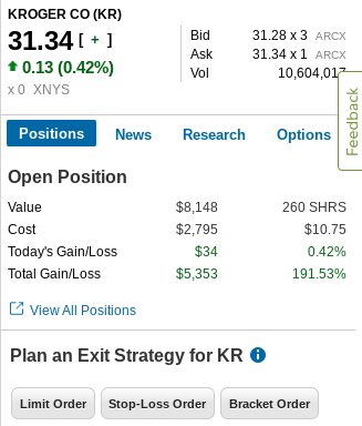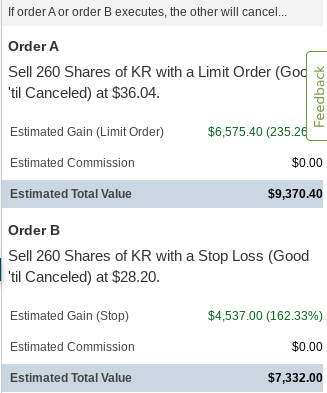 Here is an example of creating a bracket order for Kroger stock, with a limit gain of 15% from today’s price and a stop-loss of 10%. Select “Set Exit Plan” and then select the Bracket Order button to create the two linked orders.